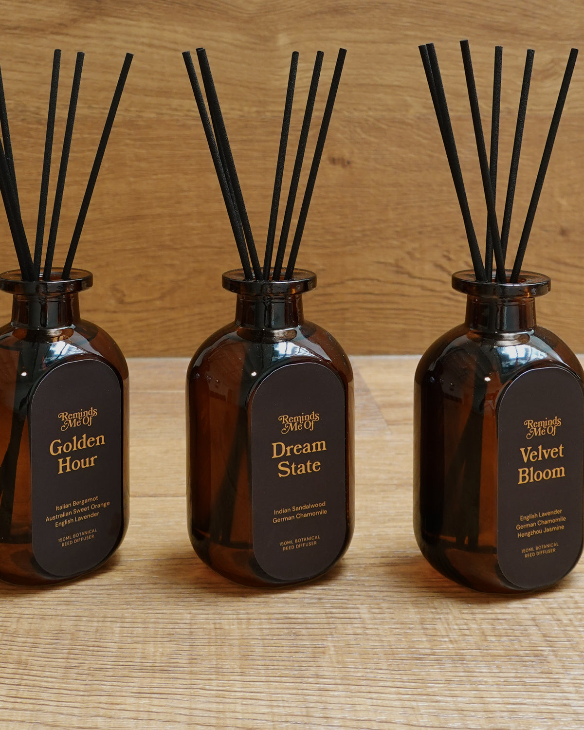 Born from nature, crafted for rest. Our Slumber Collection features three signature botanical reed diffusers made exclusively with 100% pure essential oils, each chosen for their sleep-supporting qualities and rich provenance.
